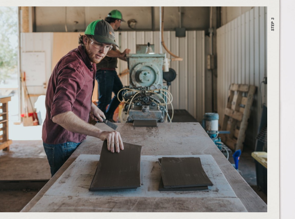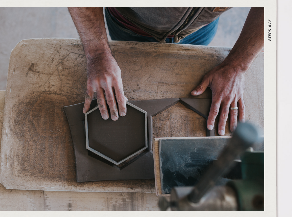 We use custom-made tile cutters to cut each tile to its final shape. Each tile is cut and trimmed by hand to ensure consistency while still retaining its artisan character. Unused and excess clay ribbon is returned to the extruder for reuse.